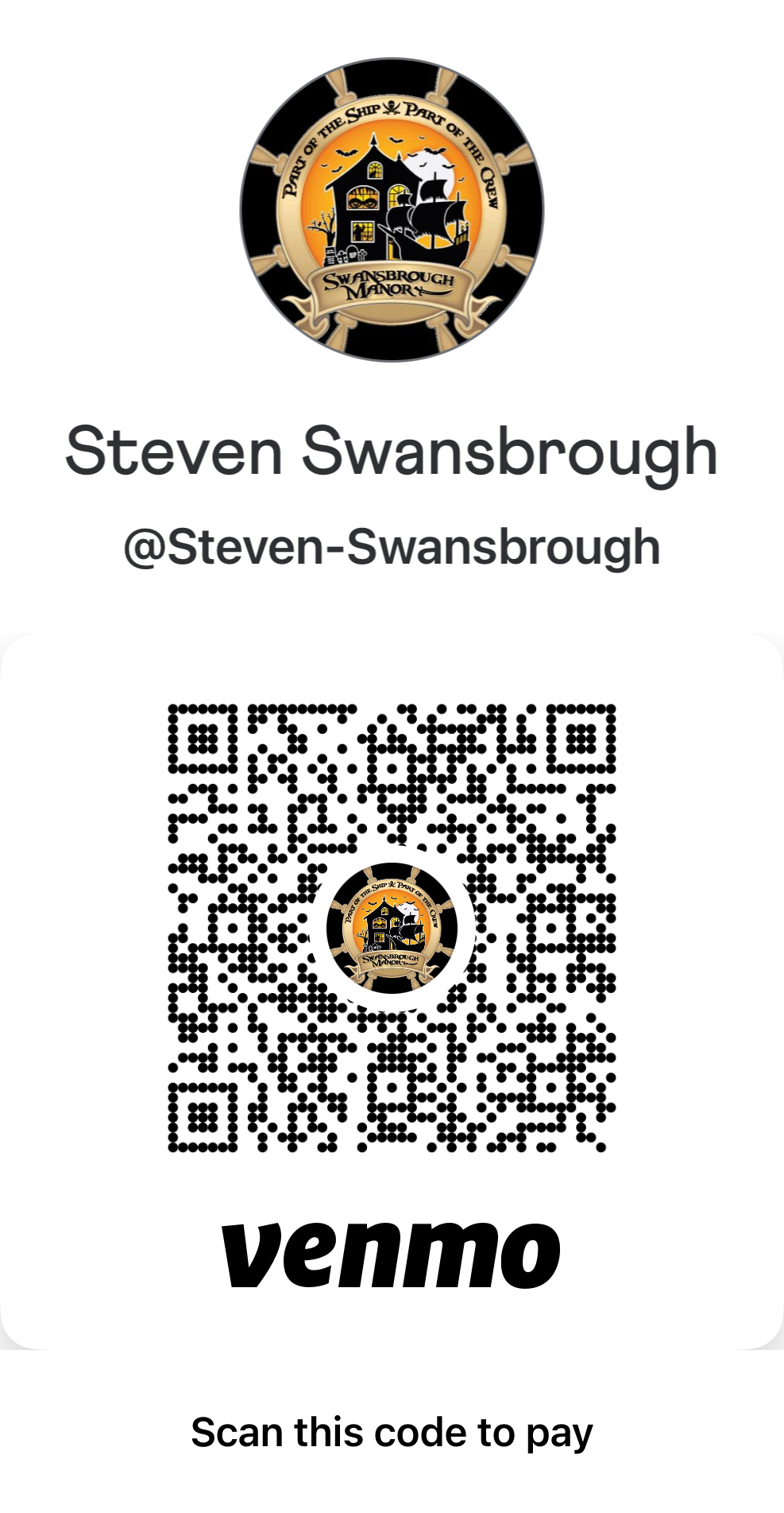Swansbrough Manor is accepting donations via Venmo. If you would like to donate, please click on the links or scan the QR code below: